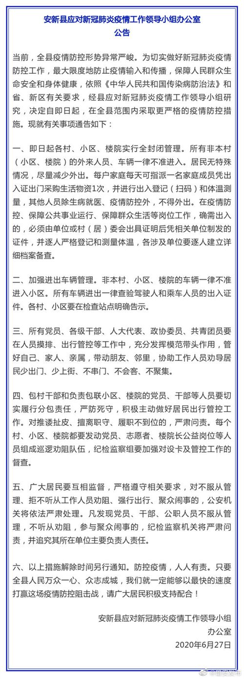 公告稱,當(dāng)前,安新全縣疫情防控形勢異常嚴(yán)峻。為切實(shí)做好新冠肺炎疫情防控工作,最大限度地防止疫情輸入和傳播,保障人民群眾生命安全和身體健康,依照《中華人民共和國傳染病防治法》和省、新區(qū)有關(guān)要求,經(jīng)縣應(yīng)對新冠肺炎疫情工作領(lǐng)導(dǎo)小組研究,決定自即日起,在全縣范圍內(nèi)采取更嚴(yán)格的疫情防控措施。有關(guān)事項(xiàng)如下: