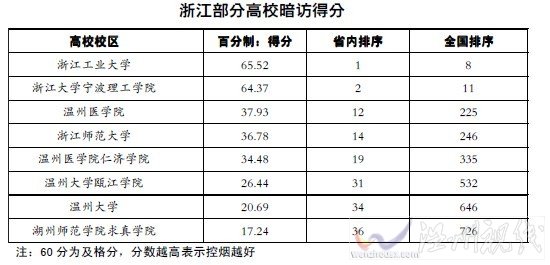 報告顯示,在暗訪浙江省的36所高校中,只有浙江工業大學和浙江大學寧波理工學院的得分合格,其中浙江工業大學得分最高,為65.52分,省內排名第1,全國排名第8;湖州師范學院求真學院得分最低,為17.24分,省內排名第36,全國排名第726。溫州醫學院、溫州醫學院仁濟學院、溫州大學甌江學院、溫州大學等溫州市4所院校的得分均不合格。