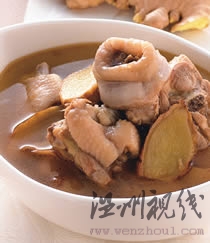 2.熱鍋倒入麻油小火燒熱,放入姜片小火爆香至顏色變深且卷曲,放入作法1土雞肉塊續炒至半熟,倒入米酒翻炒至再次滾開,再倒入熱水續煮約20分鐘,最後加入調味料拌勻即可。