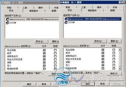 磁盤都使用NTFS格式,如果是FAT32,請轉換。命令格式如:convert c:/fs:ntfs(命令默認是C盤,如果是別的分區,請修改盤符)對根目錄的權限值保留administrator、system完全權限,如圖所示: