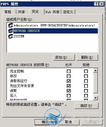 PHP使用network service這個用戶組啟動的,所以在PHP的安裝目錄我們需要給他權限,如圖所示: