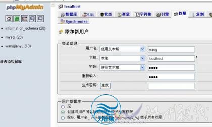 安裝好MySQL和phpmyadmin后使用root賬戶登錄,修改root為強密碼,最好是數字+大寫+小寫,如果記得住特殊符號也行。然后點權限,添加新用戶新建一個用戶,創建與用戶同名的數據庫并授予所有權限,不給予特殊權限。網站連接MySQL的用戶就使用這個新建的,千萬不要用root!如圖所示: