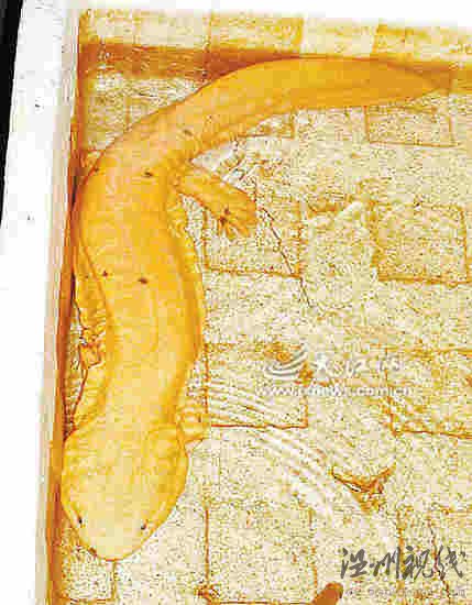 娃娃魚又叫大鯢,是國家二級保護水生野生動物之一。記者見到,黃金娃娃魚通體金黃,不帶一點雜色,甚至連眼眶都是金色的。據(jù)悉,娃娃魚一般都是黑色或褐色的,黃金娃娃魚可能是因為基因突變,所以出現(xiàn)的概率非常低。