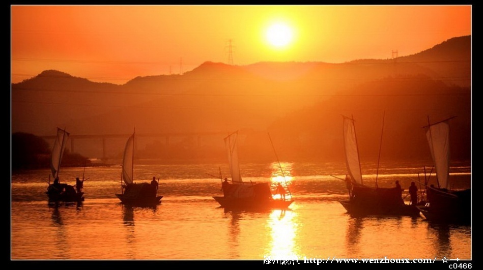 ,是為了拍攝效果組織的,現在楠溪江已經很難見到漁民駕著蚱蜢舟捕魚了,楠溪江的魚也少了,拍攝地點在甌江上游,這里現在也很少有人捕魚,很懷念幾十年前的甌江風景,夕陽下甌江口帆船點點,如詩如畫的江南