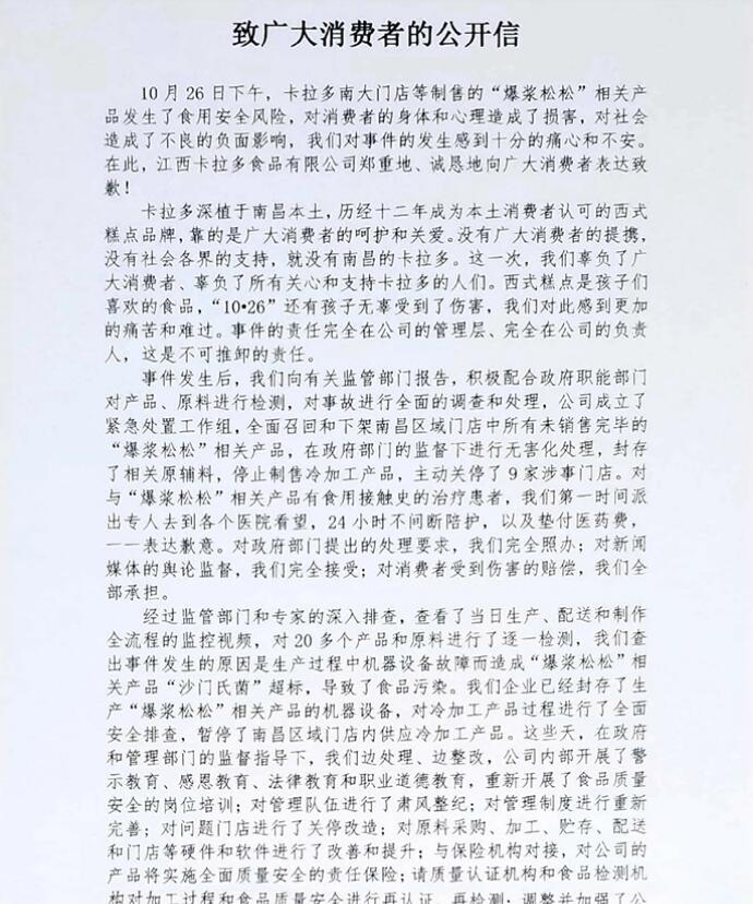 10月30日晚,江西卡拉多食品有限公司發布致消費者的公開信,經過監管部門和專家的深入調查,查出事件發生原因系生產過程中機器設備故障而造成“爆漿松松”相關產品“沙門氏菌”超標,導致食品污染。目前卡拉多食品已封存生產“爆漿松松”相關產品的機器設備,對冷加工產品過程進行全面安全排查,暫停南昌區域門店內供應冷加工產品。