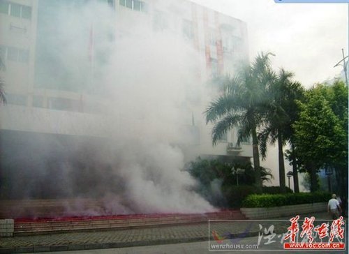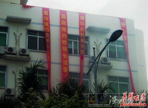 待煙霧稍微散去后,“小蝦白米”發(fā)現(xiàn)數(shù)條從樓頂垂下的橫幅。記者在“小蝦白米”網(wǎng)帖中提供的橫幅照片上看到,“最腐敗的檢察長(zhǎng)滾蛋,大快人心”的印刷字跡清晰可見。