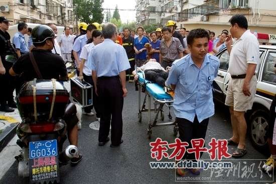 女子跳下后被急救人員迅速抬上救護(hù)車送往長(zhǎng)寧區(qū)中心醫(yī)院救治。她頭部受了傷,暫無(wú)生命危險(xiǎn)。早報(bào)見習(xí)記者孫湛圖