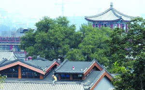下午1:15,開始有人陸續登上被舉報的3個尖頂罩棚,并緩緩向上搬運器具,搭設腳手架。記者站在尖頂罩棚正西方的高處,只能看到一兩名工人在屋頂上搬運東西。