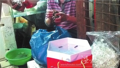某海鮮市場內的商販正在給普通蟹扣假的防偽戒指,一旁放著一大包假的防偽戒指。本版攝影本報記者潘之望