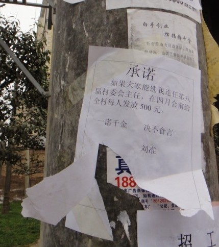 正在大家忙著按照程序準備進行選舉時,卻有人驚奇地發現,村里的電線桿上、人家門縫里都出現了一張白紙,上書“承諾”:“如果大家能選我連任第八屆村委會主任,在四月會前給全村每人發放500元,一諾千金,決不食言”,落款為“劉準”。