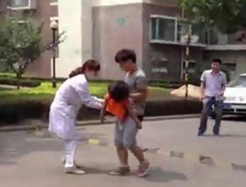 救護人員抱著受傷的王依婷趕往救護車,此時救護車仍被女版藥家鑫攔在距離事故地點幾十米外