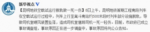 2013年1月8日上午,昆明發(fā)生地鐵脫軌事故,幸好是空載試運(yùn)行,地鐵上沒有乘客,只有司機(jī)。昆明地鐵首期工程南段列車在空載試運(yùn)行過程中,列車上行至離斗南站約500米段時(shí)列車部分設(shè)施脫軌,導(dǎo)致司機(jī)室暖風(fēng)裝置墜落,造成司機(jī)室值班司機(jī)一死一輕傷。
