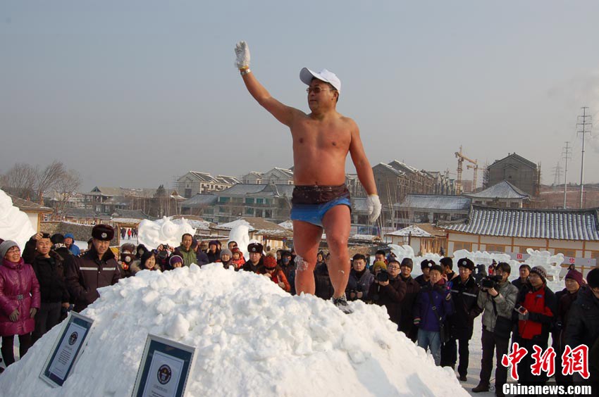 2013年1月13日上午,在延吉阿里郎冰雪節(jié)上,“世界冰王”金松浩表演耐寒絕技,令圍觀者驚嘆不已。金松浩不僅埋在齊腰深的雪坑中作畫、唱歌,零下18℃的環(huán)境在冰面上用60桶冰水沖浴。“世界冰王”金松浩極強(qiáng)的抗寒能力,真是奇人呀!