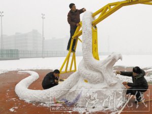 在1月22日下午,一位名叫網友@飛行的老屋在新浪石家莊吧發帖稱:在河北師范大學操場上,看見有同學在做20多米長的巨蟒雪雕,冰雕做的非常逼真,連蟒蛇身上的鱗片都依稀可見。此貼一發,立即引來大量網友圍觀,很多人大呼:河師大的學生太有才了。據了解,這個巨蟒冰雕創意來自河師大的10級雕塑系葛旭陽、祖朝陽兩名同學。作品最后則由葛旭陽、祖朝陽以及老同學畢學龍、唐艷帥一起完成。最后也由他們為這個冰雕取名“白娘子”。
