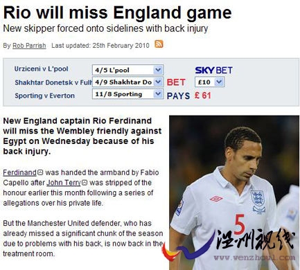 在特里因為“友妻門”事件被剝奪隊長臂章后,卡佩羅任命了費迪南德為英格蘭新隊長,但是這位曼聯中衛本賽季長期受困背部傷勢,現在他再次因為背部受傷而缺陣。