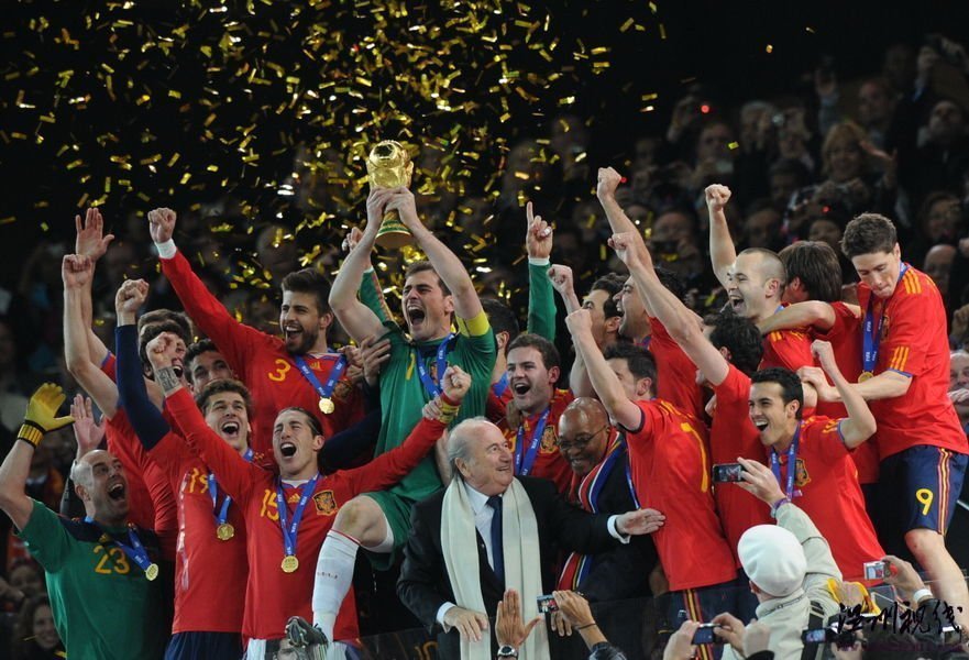 經(jīng)過120分鐘的苦戰(zhàn),西班牙終于在最后時(shí)刻絕殺荷蘭,成為歷史上第八個(gè)贏得世界杯冠軍的國家。作為隊(duì)長,卡西利亞斯從國際足聯(lián)主席布拉特和南非總統(tǒng)祖瑪?shù)氖种薪舆^了大力神杯,在全世界的注視中將它高高舉起。今夜注定無眠,而動情的圣卡西也再一次成為了斗牛士們的守護(hù)神,正是他的關(guān)鍵撲救兩次阻擋了羅本的單刀。