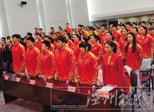 | ▲昨天,第十六屆亞運會中國體育代表團在京成立,部分運動員代表在成立大會上唱國歌。 新華社 |