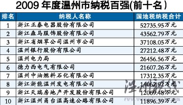 浙江正泰電器股份有限公司、浙江森馬服飾股份有限公司、浙江省煙草公司溫州市公司,分別以國地稅納稅合計52735.95萬元、43562.79萬元和37108.05萬元,名列"2009年度溫州市納稅百強"榜單前三名。