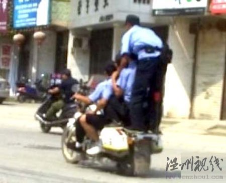 8月10日下午6點15分,一個叫"月樂"的網友在溫州網上發了一篇題為《龍灣的4個協警給大家表演摩托車特技,難得一見哦》的帖子,還配有一組4名協警共騎1輛摩托車的照片。"月樂"在帖中說,8月10日上午10點左右,在龍灣往梅頭的路上,永強大道那里拍到的!看過摩托車表演雜技的,還真沒看過協警也搞這手的……