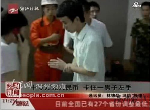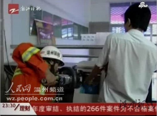 前天(8月18日)下午四點多,溫州市甌海區的一個郵政儲蓄所里,一名男子的左手被十多萬元人民幣卡住,無法取出,救援人員隨即趕到現場對該男子進行施救。