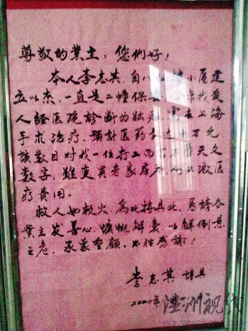 昨日,記者在八仙樓小區2幢的樓下,看到了一張由業主周老伯代筆,以李志其為第一人稱書寫的求助信。內容大致為:李妻需要10萬元的巨額手術費,懇請大家幫助。周老伯告訴記者,保安李志其很熱心,他每次看到業主手提重物,都會主動上前幫忙搬運,如遇到手腳不方便的老人或者兒童都會主動上前攙扶,其熱心和勤懇得到了業主們的認可。