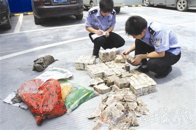 透過塑料紙能很清晰地看到包捆的紙帶上有“中國人民銀行”和“某某人”的字樣,還標有編號。隨即,民警將這些紙幣運回派出所,并通知了中國人民銀行工作人員。