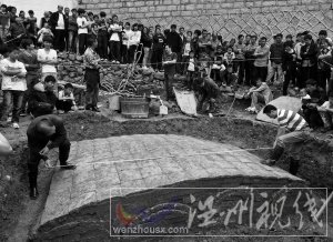 永嘉縣橋頭鎮龍根村一村民在老房拆建打樁基時,意外地發現了一座四穴相連的古墓。溫州市文物保護考古所、永嘉縣文物館等有關專家經過兩天的挖掘清理,于昨天下午打開了墓穴,結果所有墓穴里除了骸骨和幾根棺材的爛釘外,別無它物。