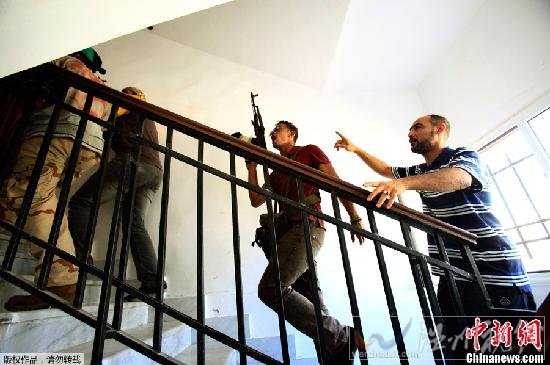 8月25日,在利比亞反對派武裝攻入卡扎菲官邸所在的阿齊齊亞兵營后,利比亞領(lǐng)導(dǎo)人卡扎菲的去向仍然不明,反對派武裝繼續(xù)在的黎波里全城搜捕,據(jù)報(bào)道差點(diǎn)將其抓獲。圖為反對派武裝人員正在尋找政府軍狙擊手。