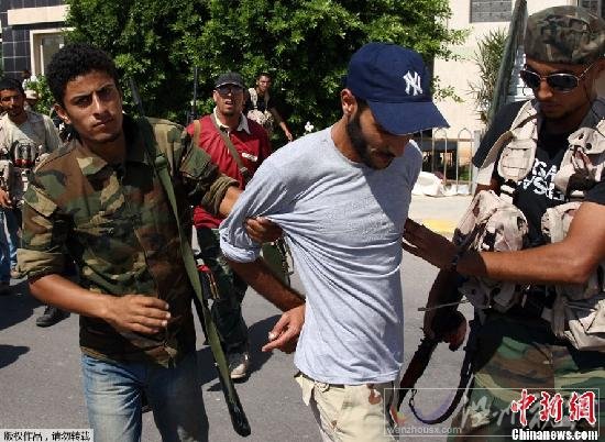 8月25日,在利比亞反對派武裝攻入卡扎菲官邸所在的阿齊齊亞兵營后,利比亞領(lǐng)導(dǎo)人卡扎菲的去向仍然不明,反對派武裝繼續(xù)在的黎波里全城搜捕,據(jù)報(bào)道差點(diǎn)將其抓獲。圖為一名卡扎菲支持者被捕。