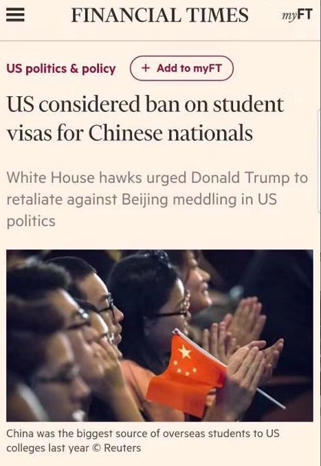 留學(xué)公眾號“北美留學(xué)生日報”,昨晚根據(jù)金融時報報道等資料,對這個新聞進(jìn)行了解讀,文章標(biāo)題是“美國擬禁止中國人去美國留學(xué)?取消中國留學(xué)生簽證?這是真的嗎?”。