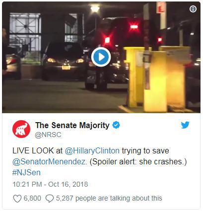 希拉里遭遇車禍:推文“希拉里克林頓試圖拯救梅嫩德斯參議員(劇透:她撞上了)”。