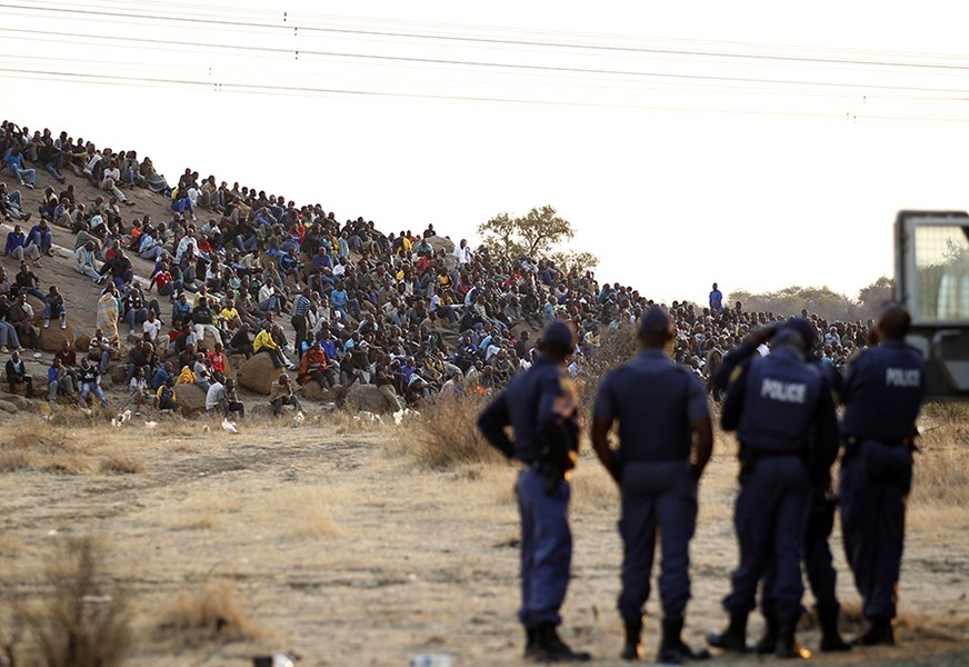 8月17日南非警察與礦工沖突圖片,南非西北省馬瑞卡那礦區暴動已經造成至少34人死亡,78人受傷。該礦區屬于英國的隆明公司,礦工們為增加工資從10日起開始罷工。此后,罷工行動演變成暴動。有報道稱,南非警察與礦工槍戰,造成大量人員死亡。南非總統表示震驚,責成警方調查,圖為當地時間8月16日,警察在罷工礦工聚集地點附近警戒。