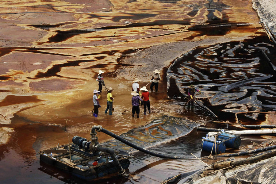 工人正在處理含銅酸水7月13日,工人正在處理位于福建上杭紫金山銅礦濕法廠污水池中的含銅酸水。7月12日,福建省龍巖市上杭縣召開新聞發(fā)布會,通報上杭紫金礦業(yè)集團(tuán)股份有限公司紫金山銅礦濕法廠污水滲漏事故,據(jù)悉,有9100立方米的含銅酸水外滲引發(fā)汀江流域污染。