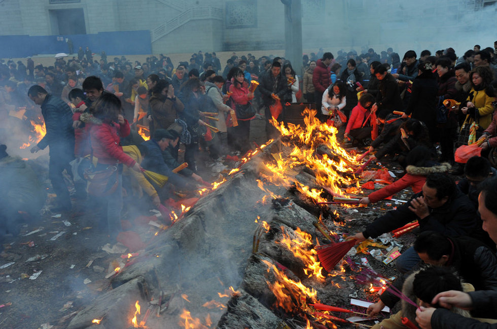 縣大箬巖陶公洞點佛燈的香客擠爆了,買的香燭都沒有地方插,只好放在那里,陶公洞今年仍然出現5800元一對的大蠟燭。圖為武漢近40萬香客陸續涌往歸元寺,以敬香“迎財神”的方式,為蛇年祈福。