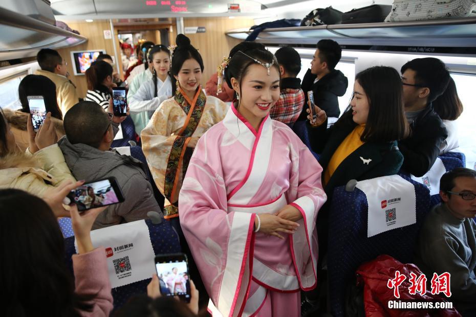 動妹兒披漢服走秀:近日,西成高鐵開通了,12月9日,在成都發(fā)往西安的D4252列車上,四川西南航空學院二十多名準動妹兒披漢服走秀,為旅客帶來一場穿越之旅。