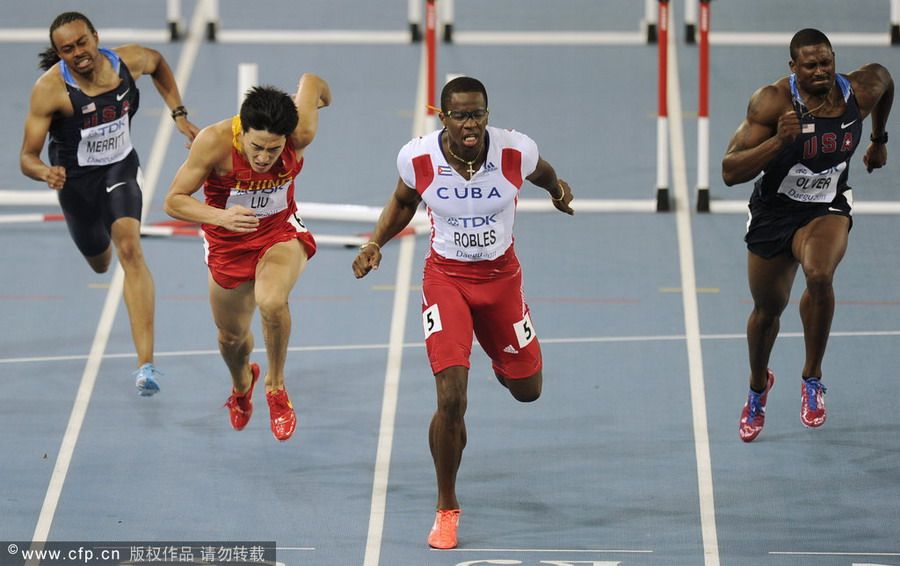 劉翔110米欄本來有奪冠機會,跑到只剩最后兩個欄被干擾,羅伯斯110米欄\"打手\"犯規冠軍遭取消。北京時間8月29日,2011年大邱田徑錦標賽進入到第三日的爭奪。在引人矚目的男子110米欄決賽中,中國飛人劉翔在通過第九個欄架時與羅伯斯的手臂碰到了一起,結果被帶亂節奏的劉翔以13秒27奪得銅牌,這也是他獲得的第四枚世錦賽獎牌。古巴選手羅伯斯以13秒14拔得頭籌,奪得了個人首個世錦賽冠軍。美國選手理查德森以13秒16屈居亞軍,奧利弗僅以13秒44排名第五。