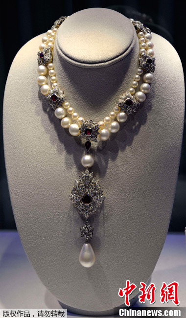 伊麗莎白·泰勒的項鏈,11月15日,在法國巴黎的克里斯蒂拍賣行,已故影星伊麗莎白·泰勒的第五任丈夫理查德·伯頓贈給她的一條項鏈正在展出。已故美國影星伊麗莎白·泰勒不僅是時尚偶像、慈善家,還是一位狂熱的珠寶收藏家。她生前所擁有的百余件珍藏珠寶精品于2011年9月15日開始為期3個月的全球巡展,并將于2011年12月在紐約佳士得拍賣行進行拍賣。