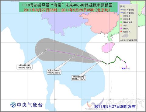 今年第18號熱帶風暴“海棠”的中心9月27日05時位于越南中部近海海面上,就是北緯16.8度、東經108.4度,中心附近最大風力有8級(18米/秒),中心最低氣壓為995百帕。