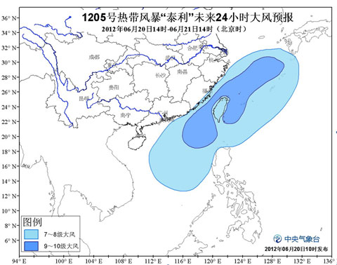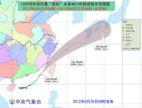 根據中央氣象部門預計,受臺風“泰利”和西南季風的共同影響,6月20日14時至6月21日14時,南海大部海域、巴士海峽、臺灣海峽、臺灣以東洋面、我國東海大部海域以及廣東東部沿海、福建沿海、臺灣沿海、浙江中南部沿海將出現6-8級大風,我國部分海域或地區還將出現9~10級陣風,臺風“泰利”中心經過的附近海域將出現8~9級的大風天氣,局部的陣風可達10~11級;浙江東南部、福建東部、臺灣、廣東東部和西南部、廣西東南部、海南北部等多個地區將出現大到暴雨,其中,浙江東南部和福建東北部沿海地區、臺灣西部等地的部分地區將出現大暴雨(預計降雨量達100~160毫米)。