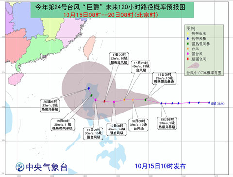 中央氣象臺15日10時發(fā)布的臺風路徑預報圖
