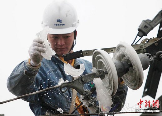 近日,中國南方地區(qū)出現(xiàn)新一輪低溫雨雪天氣過程。南方電網(wǎng)積極應(yīng)對(duì)開展大規(guī)模線路融冰除冰。在一些山區(qū),電力工人采取人工除冰方式保證電力線路正常運(yùn)行。圖為1月10日電力工人正在廣西融安縣板欖鎮(zhèn)東嶺村的高寒山區(qū)清除電力設(shè)施上的凝冰。中新社發(fā) 譚凱興 攝