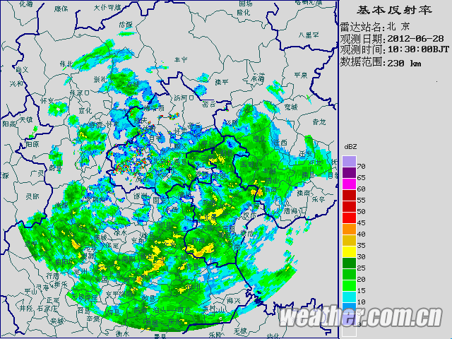 中國天氣網訊 根據北京市氣象部門監測,在6月28日13時24分,北京主城區還有零星的回波存在,目前,北京的主城區降水暫停,北京西北部(延慶)和東北部(懷柔、平谷及密云西南部)等地區還有出現回波,但回波強度較弱,強度在15-25dbz。