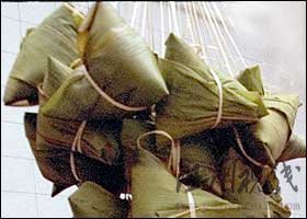 傳說屈原死后,楚國百姓哀痛異常,紛紛涌到汨羅江邊去憑吊屈原。漁夫們劃起船只,在江上來回打撈他的真身。有位漁夫拿出為屈原準備的飯團、雞蛋等食物,“撲通、撲通”地丟進江里,說是讓魚龍蝦蟹吃飽了,就不會去咬屈大夫的身體了。人們見后紛紛仿效。一位老醫(yī)師則拿來一壇雄黃酒倒進江里,說是要藥暈蛟龍水獸,以免傷害屈大夫。后來為怕飯團為蛟龍所食,人們想出用楝樹葉包飯,外纏彩絲,發(fā)展成棕子。