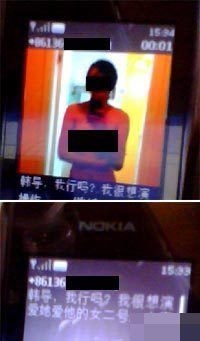 導演韓赤飛在微博中爆料,稱一女演員向自己發送裸照彩信,其目的是求演《愛她愛他》的女二號。他在微博中解釋稱,處于不想傷害圈內藝人的目的,自己對圖片做了必要處理。從圖片中可以清晰的看出,該演員通過一個開頭為136的手機號,向韓赤飛發送了一張上半身裸露的照片,并稱:“韓導,我行嗎?我很想演愛她愛他的女二號。”
