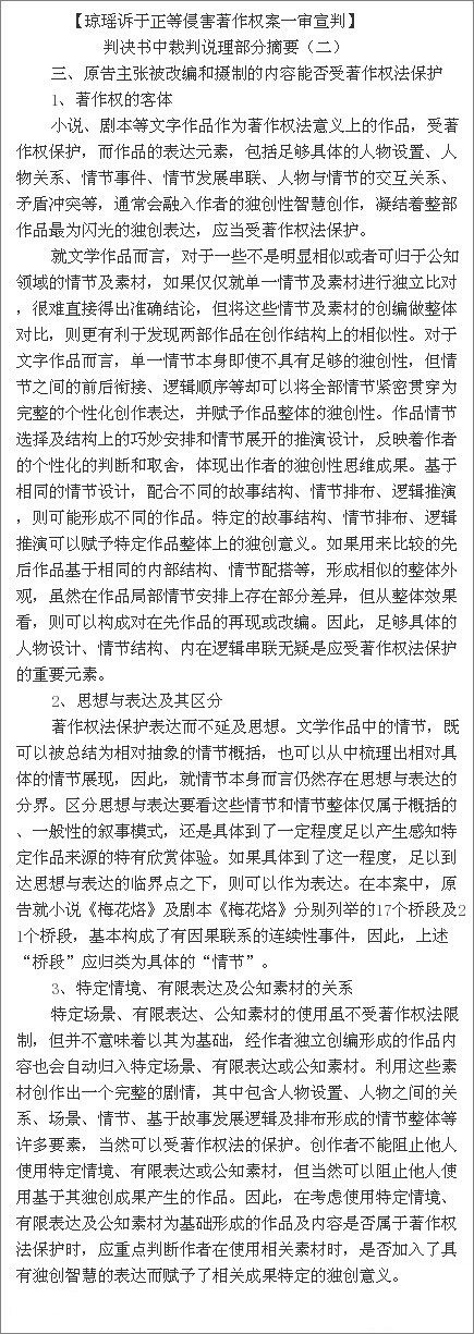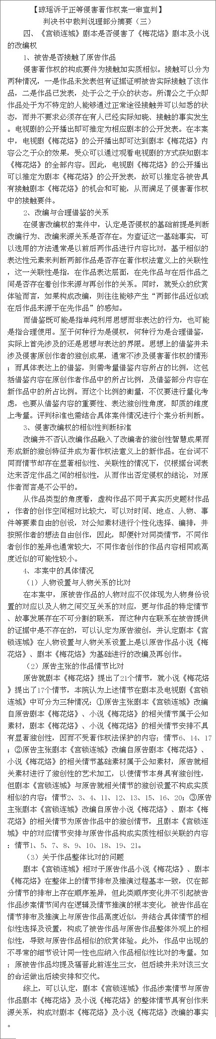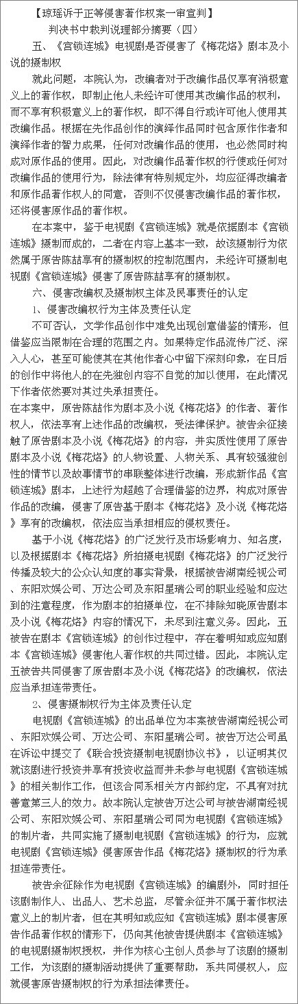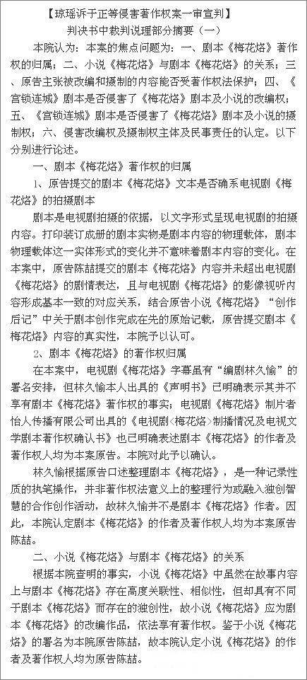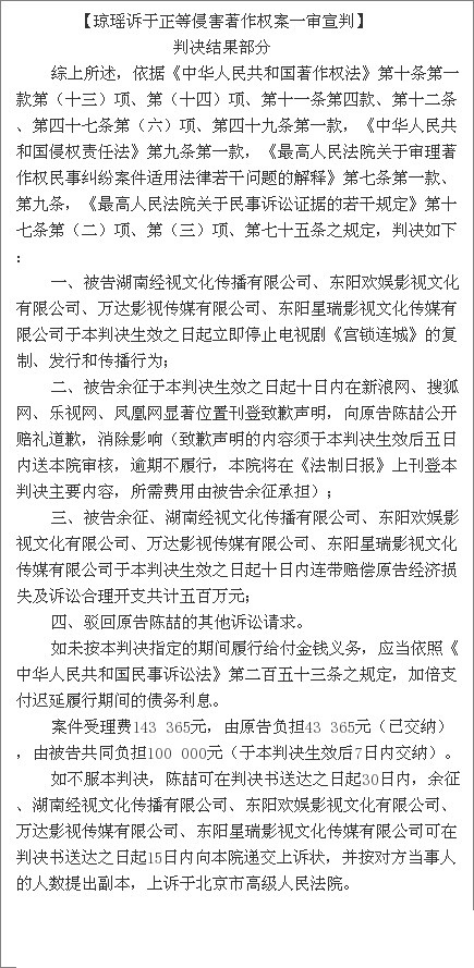 瓊瑤訴于正案判決書 于正抄襲案一審判決書