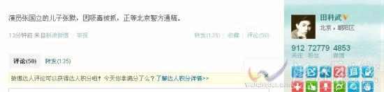 張默因涉嫌吸毒被捕:北京青年報北京新聞版微博截圖