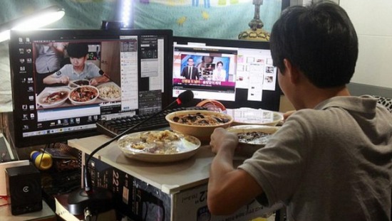 金宋真用網(wǎng)上直播視頻應用軟件Afreeca TV在家中直播吃飯,吃披薩、炸雞或者中餐,期間還打嗝或者上廁所。就這樣,每晚收入上萬元。