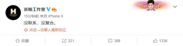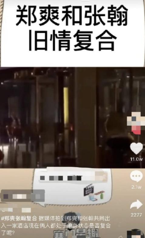 張翰方否認與鄭爽復合:近日,有網友爆料張翰與鄭爽舊情復合,并且附上一段兩人先后進入某酒店的模糊視頻,張翰方否認稱:"沒聯系,沒復合"。